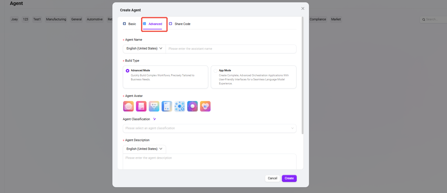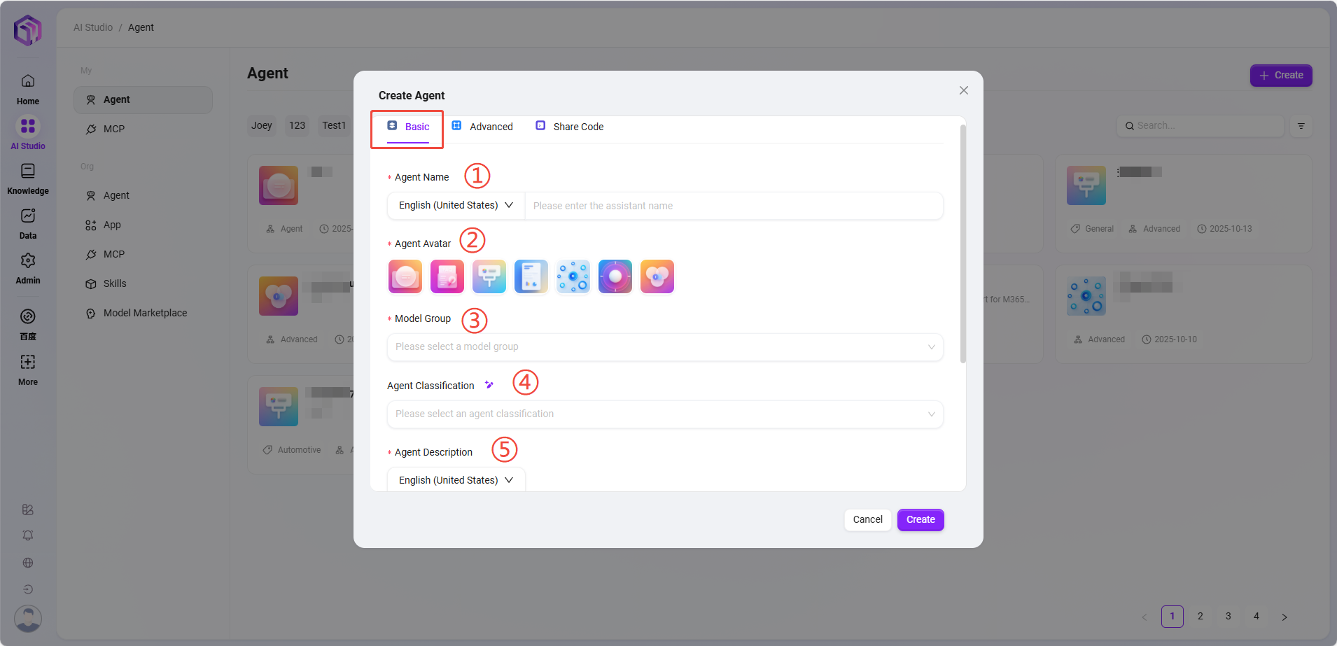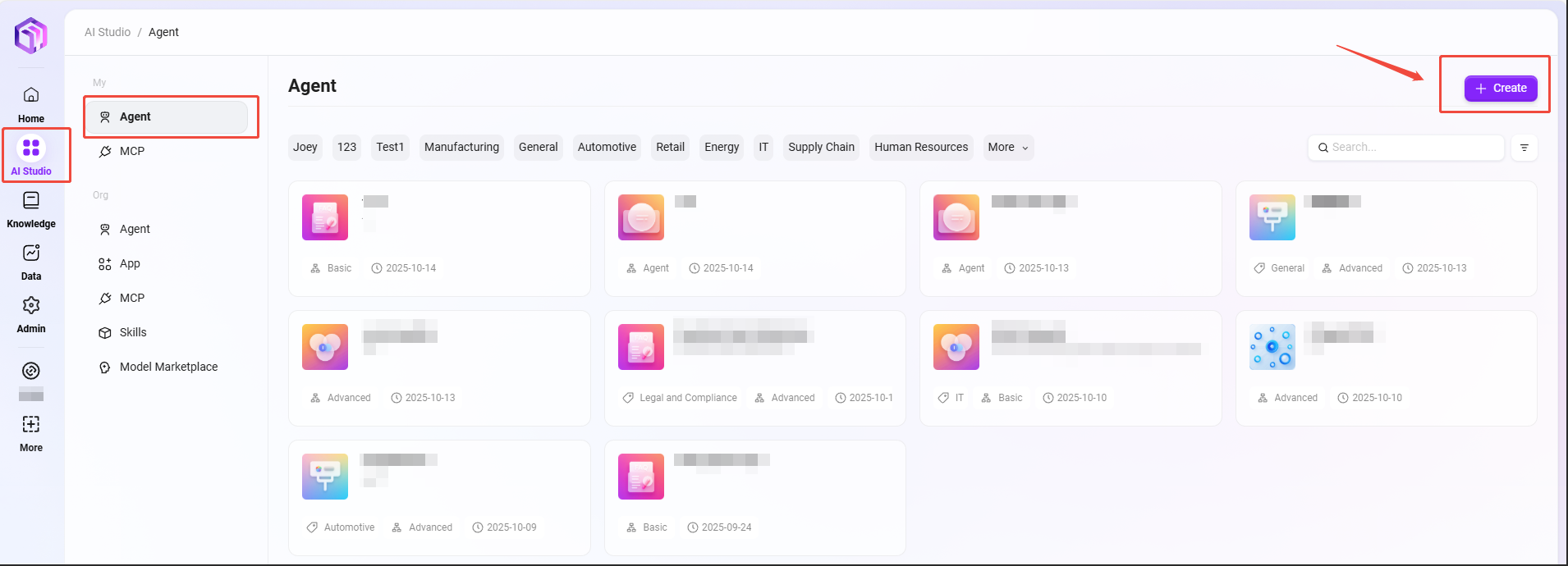 1. 在AI Sudio页面的右上角,点击“创建”创建基础智能体