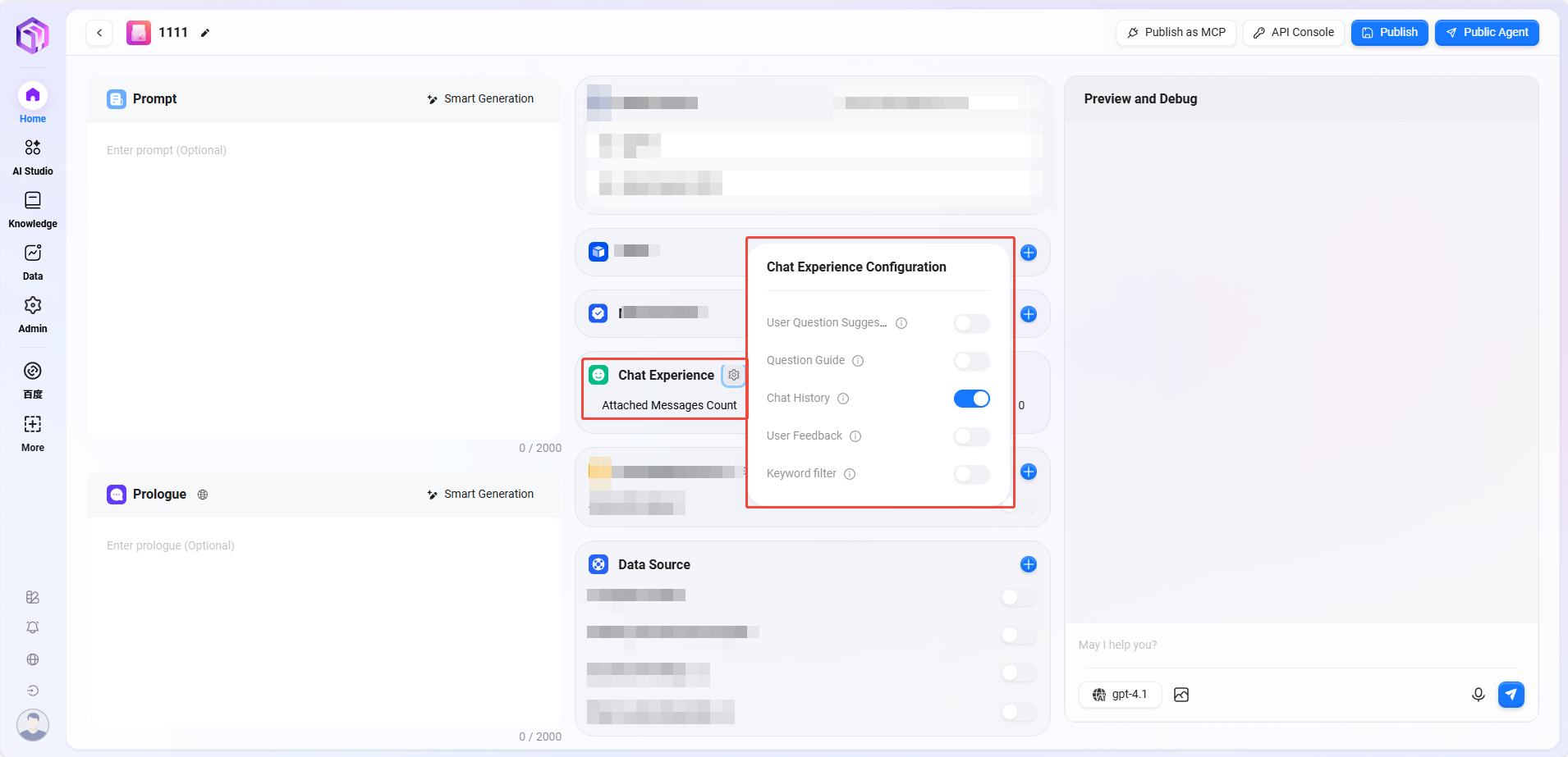 • 对话设置:可以开启“用户问题建议、问题引导、聊天记录、对话反馈、关键词审查”等设置