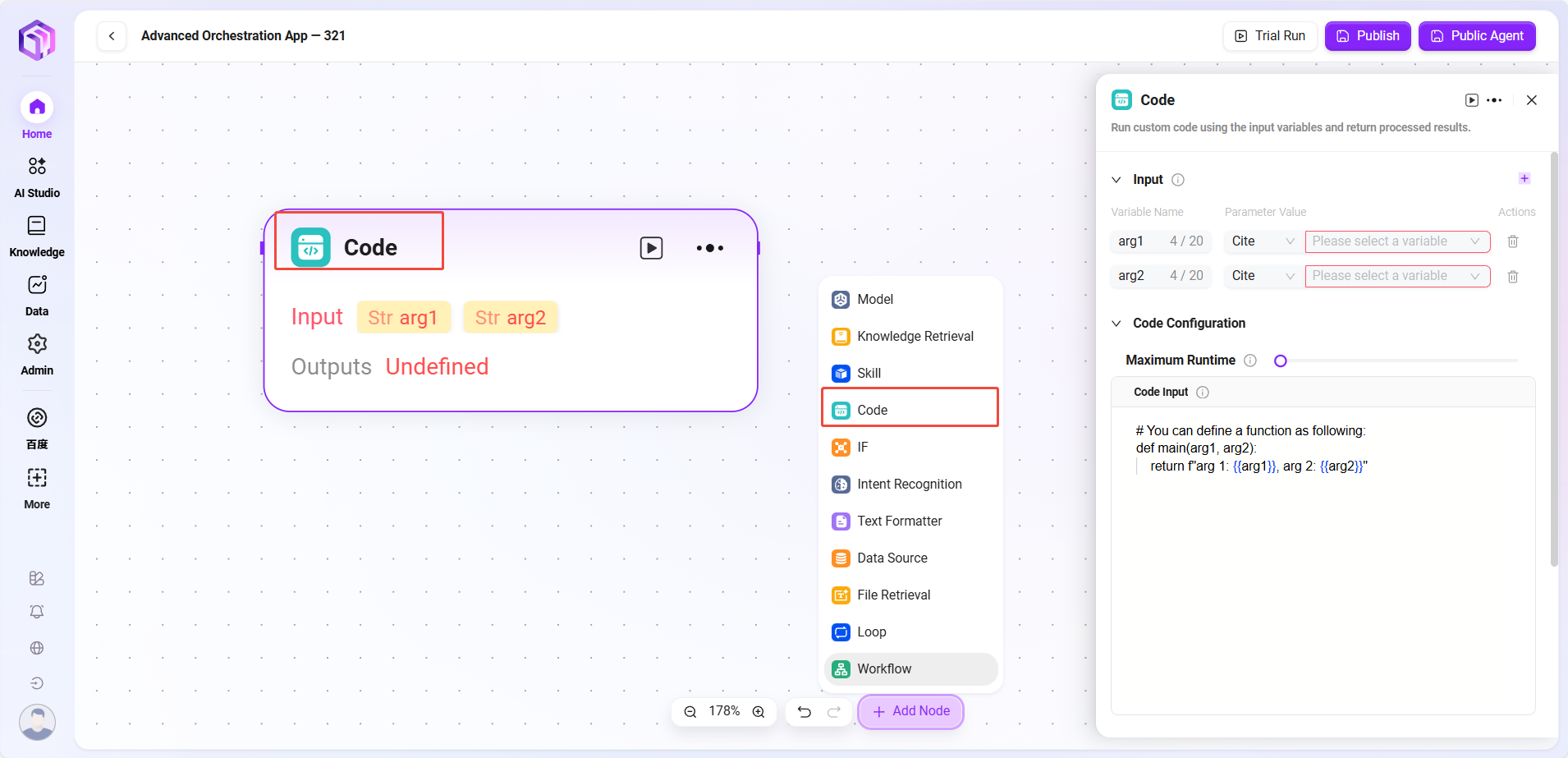 💡 提示:需要先连接上前置节点,才能选择其他节点的变量作为当前节点的输入变量