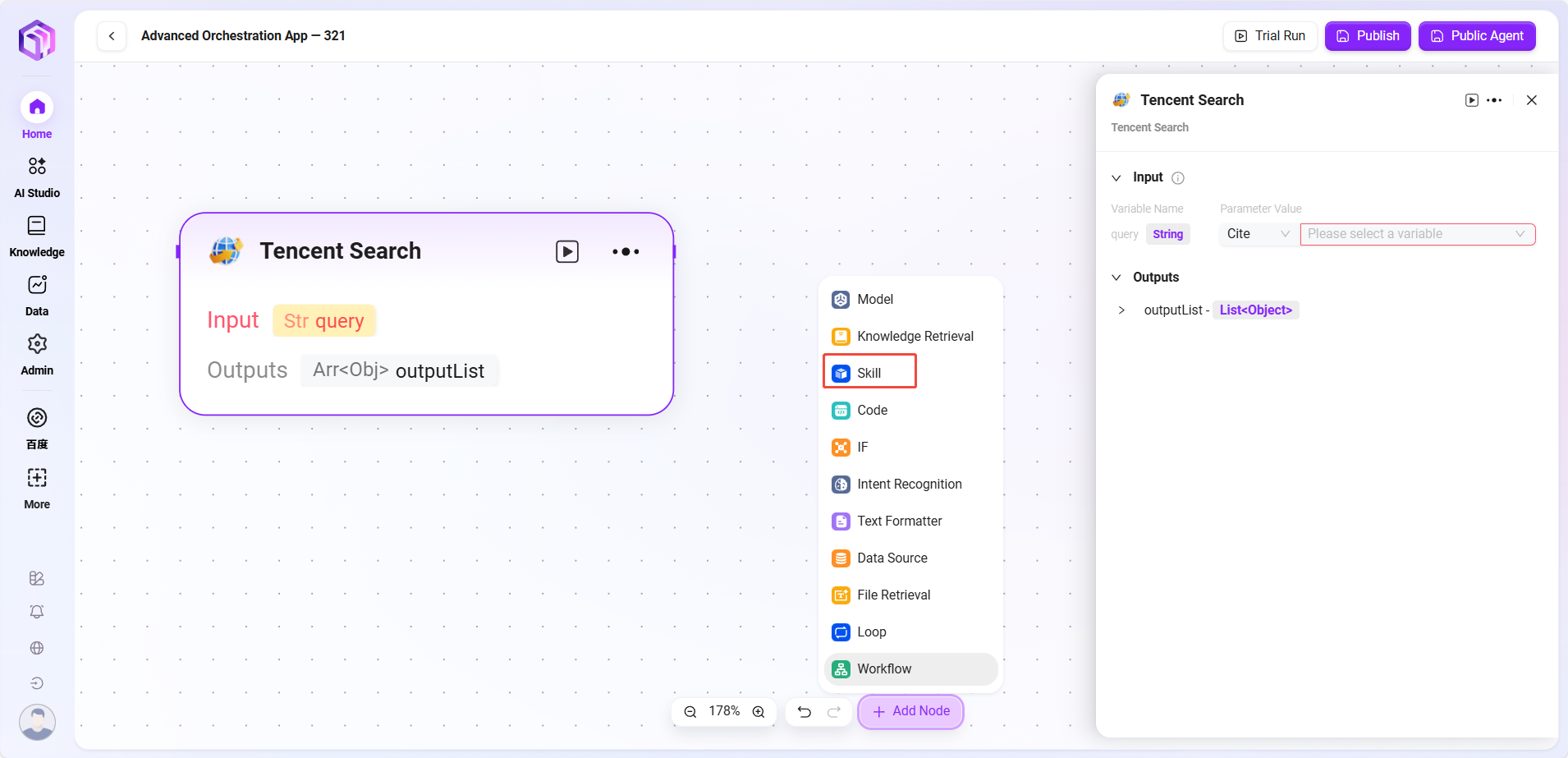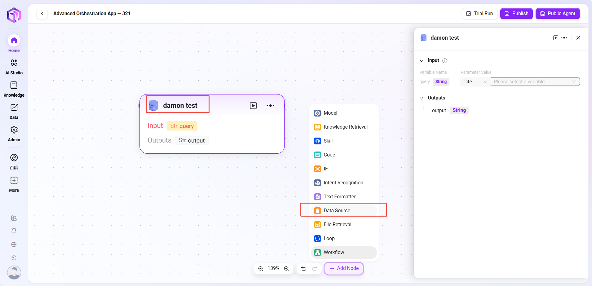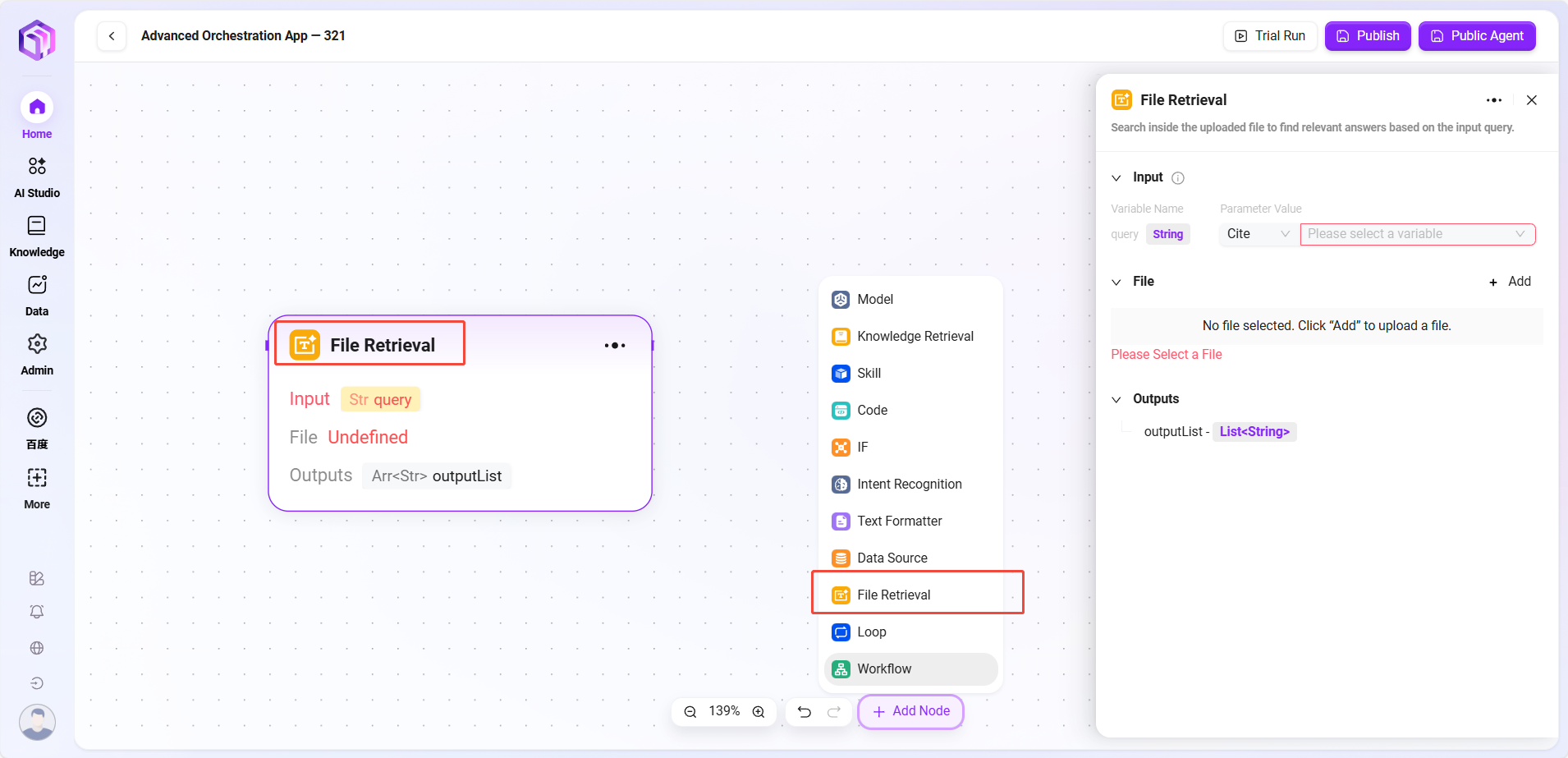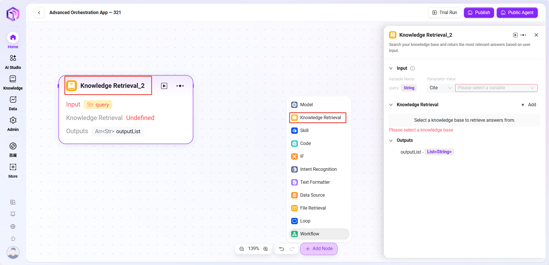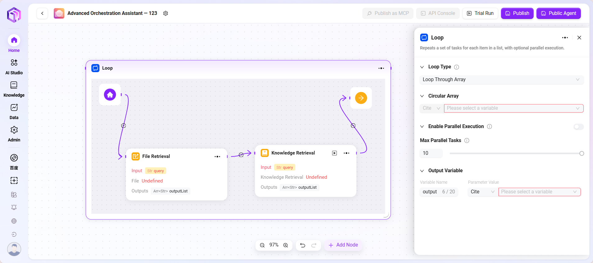 • 输出:将从知识库中检索到的匹配信息,以指定变量的形式输出,供后续流程使用