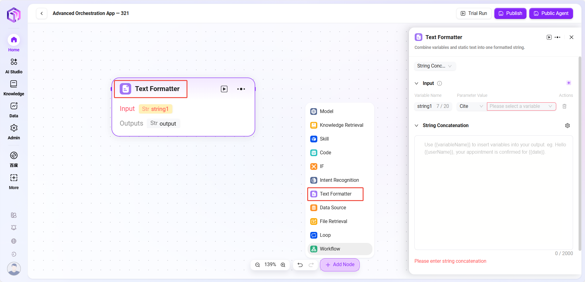 • 字符串拼接:提供文本编辑区域,可按需求使用变量名方式引用输入变量,对多个字符串进行拼接等格式处理
