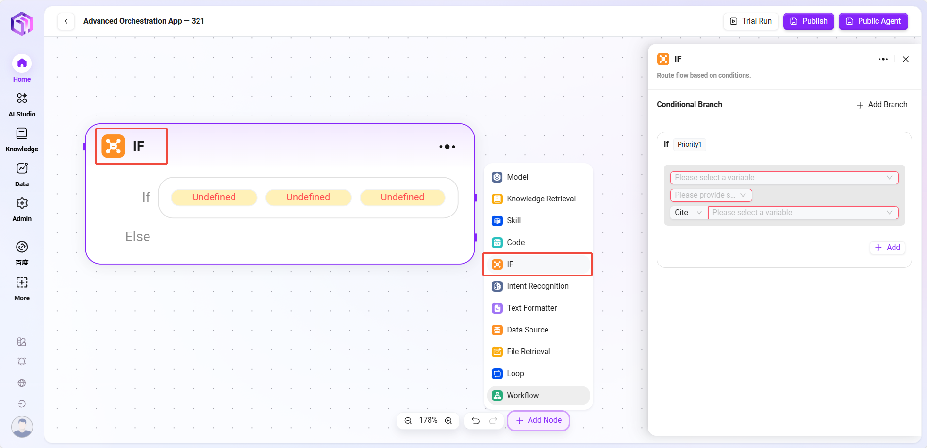 • 条件分支:可设置多个条件,如 “if - 优先级 1” 。通过配置引用变量、选择条件(如等于、大于等比较逻辑 )、比较值,来判断条件是否成立。若成立,就运行对应的分支流程。