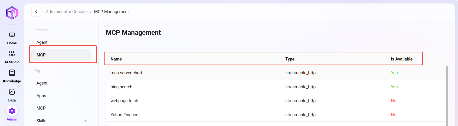 管理员可以在系统中管理个人MCP服务,这些服务用于扩展智能体的外部能力。通过MCP管理,用户可以为个人智能体连接各种外部工具和数据源。