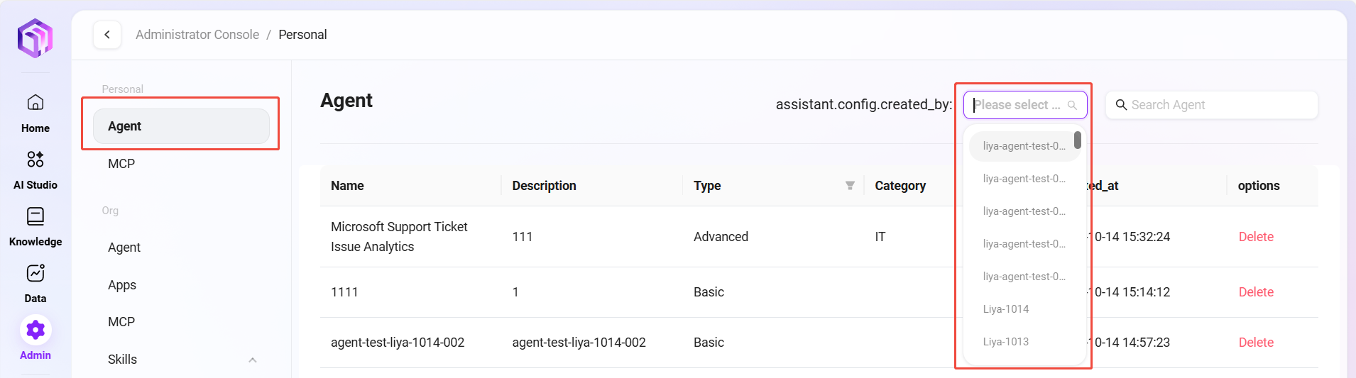 管理员可以在系统中管理个人智能体,这些智能体是用户根据自身需求创建的AI助手。通过智能体管理,用户可以组织、维护和优化自己的AI助手资源。