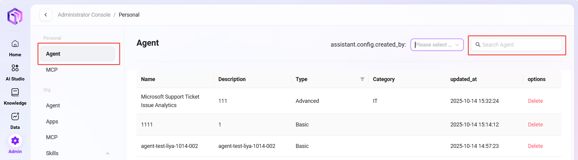 管理员可以在系统中管理组织级智能体,这些智能体是经过审核并提升为组织级资源的AI助手。通过组织Agent管理,管理员可以确保组织内部AI助手的质量和一致性。