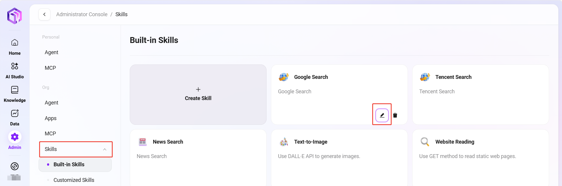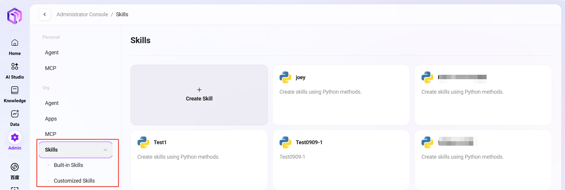 管理员可以在系统中管理组织级技能模块,这些技能是智能体可以调用的功能组件。通过组织技能管理,管理员可以沉淀和复用企业的核心业务能力。