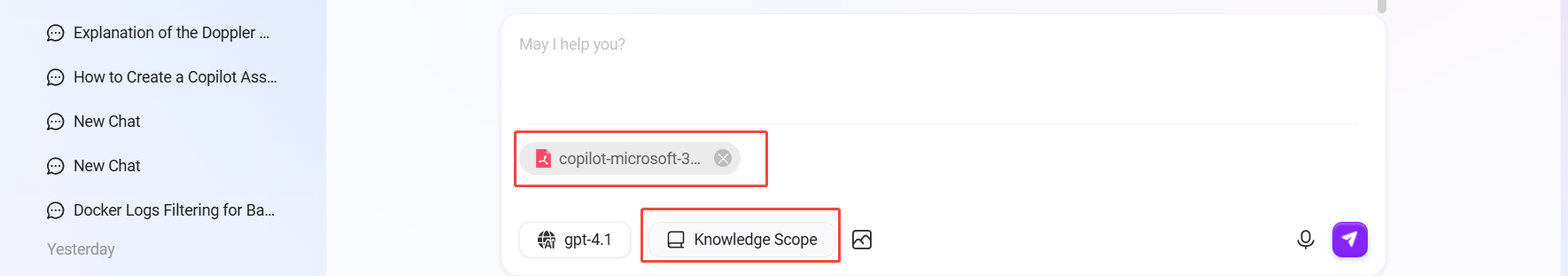 在使用助手时,如果想要对单个文档进行问答,可以在对助手进行知识来源配置后,在知识范围中选择单个文档。