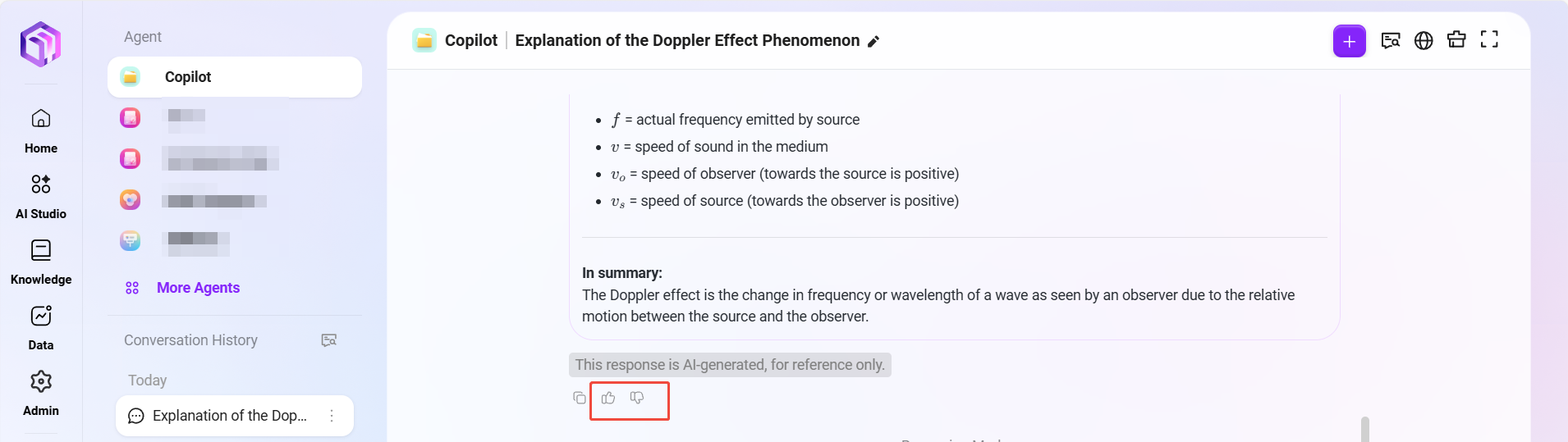 对于Agent生成的回复,用户可以通过点赞或者点踩操作进行评价。