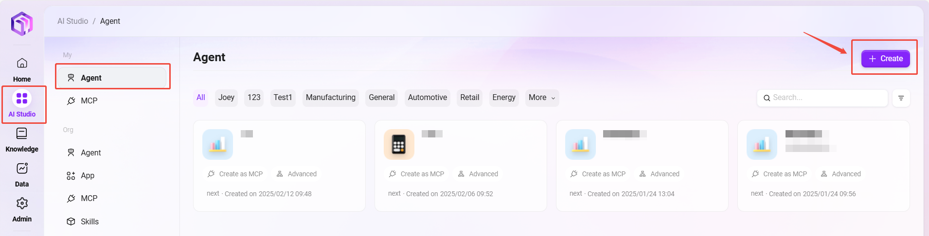 - 进入 SERVICEME NEXT 首页,点击左侧导航栏的AI Studio,进入 Agent 界面。