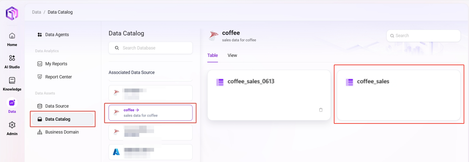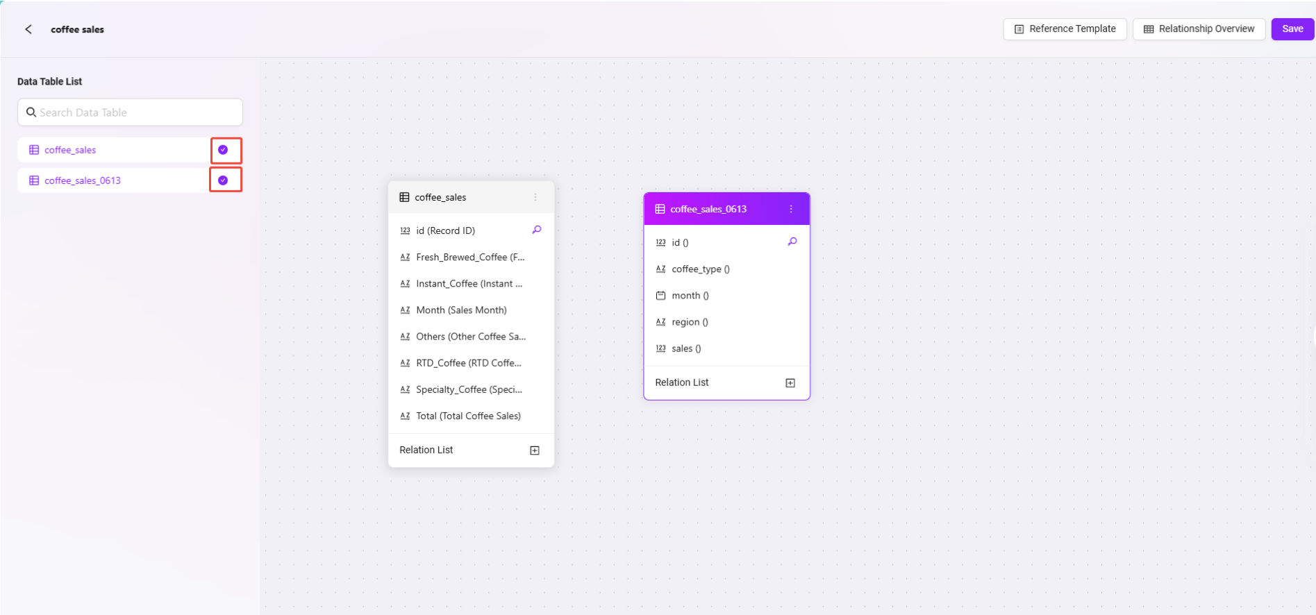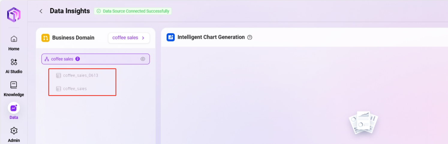 coffee sales。 - 成功选择后,页面将自动加载该业务域下的两张表: