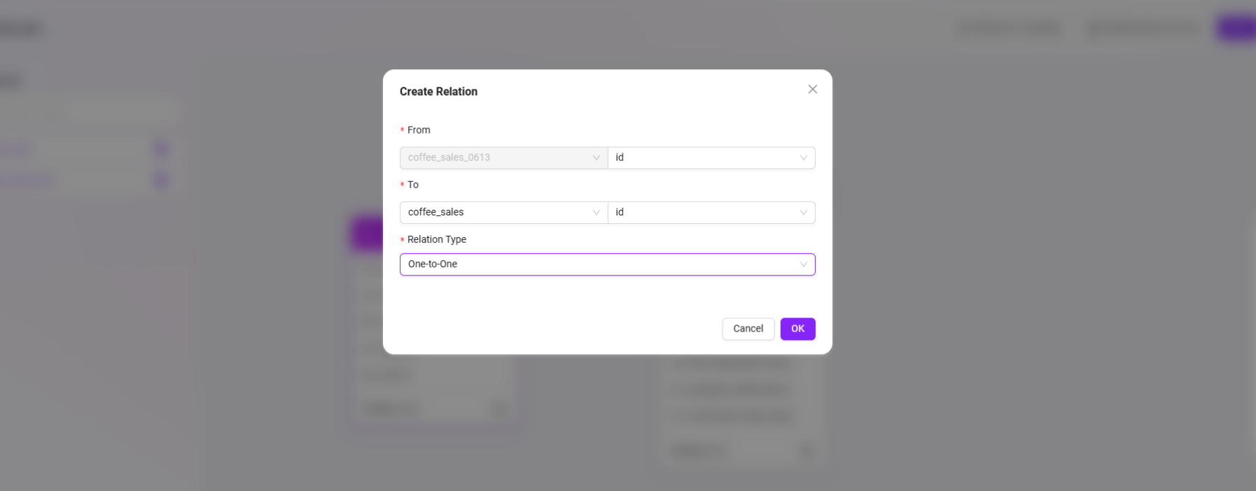coffee_sales.id - Relation Type(关系类型):选择“一对一”