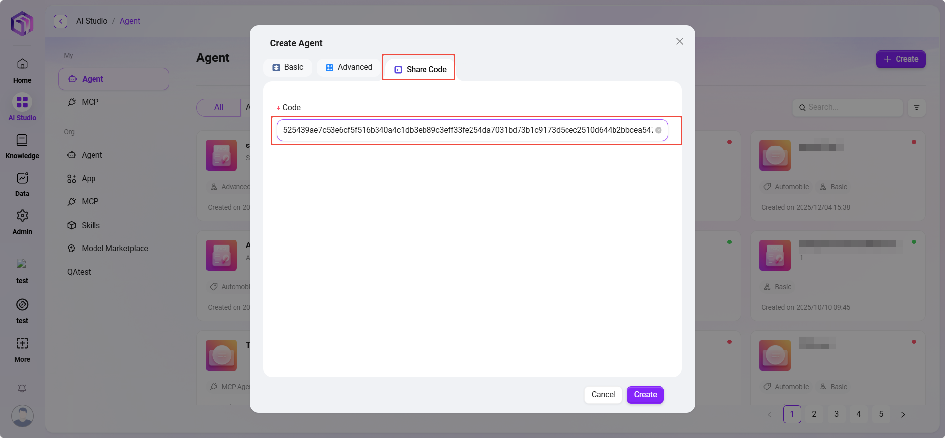 配置码的时效性:配置码可能会因源 Agent 的更新而失效。如果创建失败,请联系分享者获取最新的配置码。