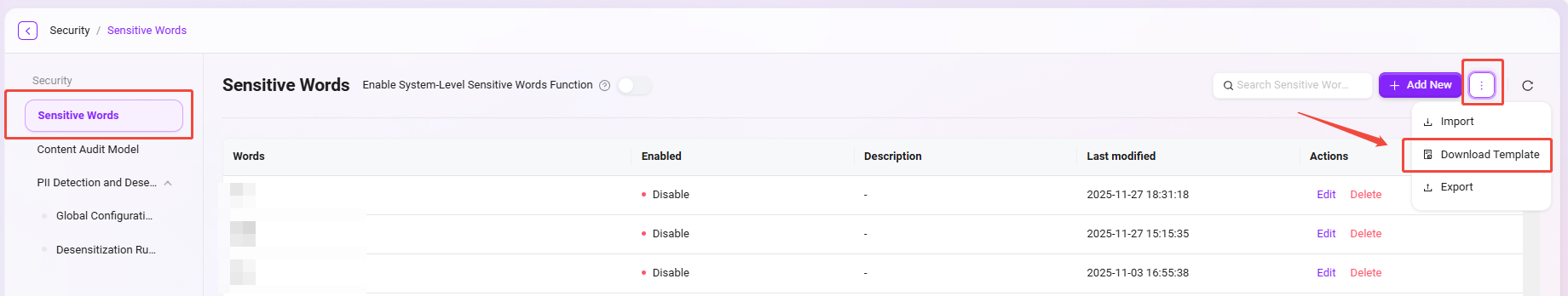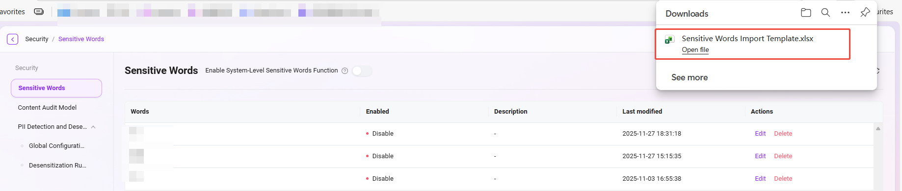 内容安全管理 -> 敏感词 -> 下载模板。 - 系统将自动下载 Excel 文件,默认命名为: