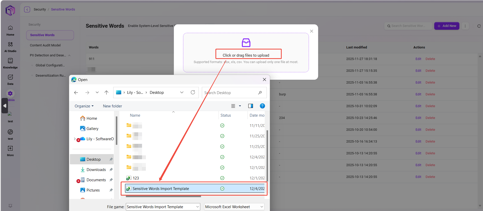 内容安全管理 -> 敏感词 -> 导入。 - 点击上传区域上传,或将模板文件拖拽上传。