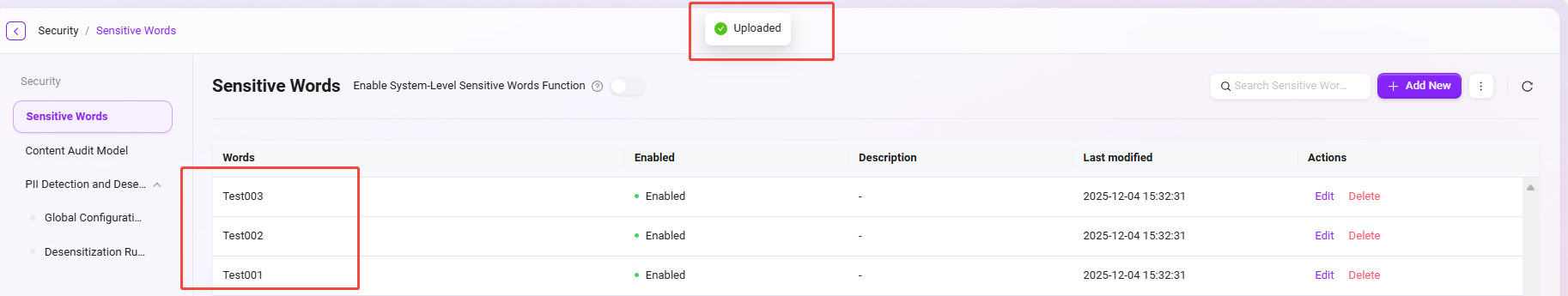 - 导入成功后将显示“上传成功”提示,并在列表中显示新增敏感词。