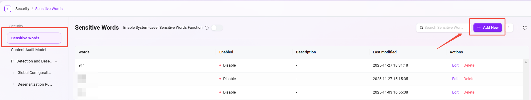 启用或停用。 - 描述(可选):补充说明敏感词的添加背景(500字以内)。