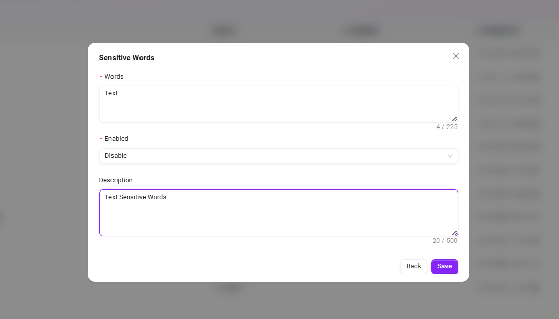 - 支持描述信息,便于记录敏感词设置背景及用途。