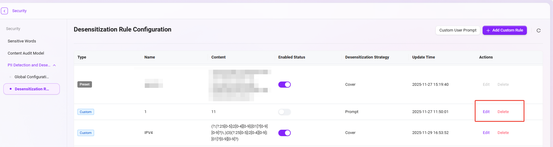 “脱敏规则配置”用于定义系统在检测到涉及个人敏感信息(PII)时的处理策略。通过设置不同的规则与策略,管理员可灵活控制系统对敏感数据的识别、提示及脱敏方式,确保数据合规与隐私安全。