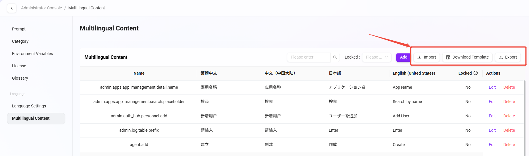 - 模板中包含规范的字段名称(如 Code、ja-JP、zh-TW、zh-CN、en-US),管理员可直接在模板中填充内容后导入,确保格式正确无误。
