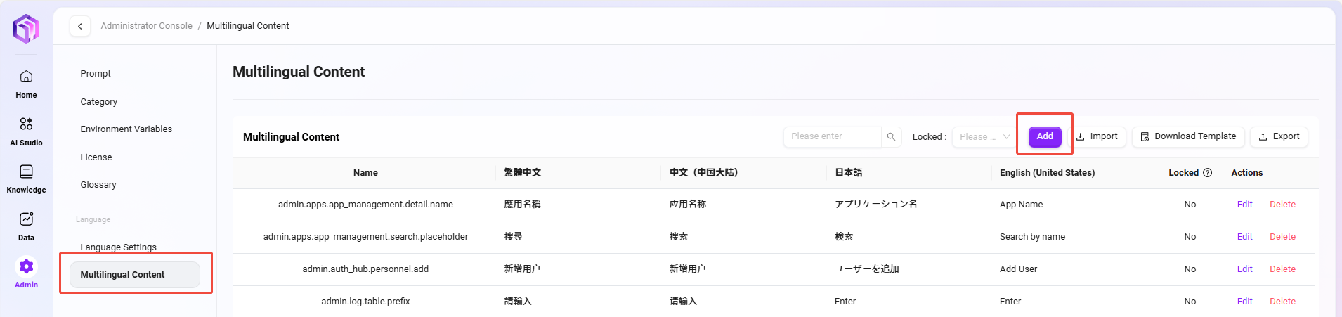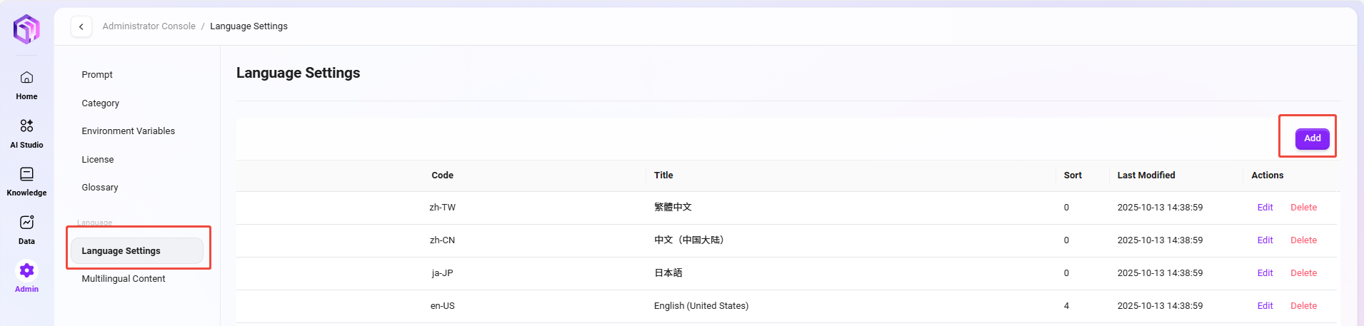 - 进行操作:管理员可以对每一行内容进行编辑或删除,点击对应的“编辑”按钮,修改语言内容;点击“删除”按钮,删除不需要的配置项。