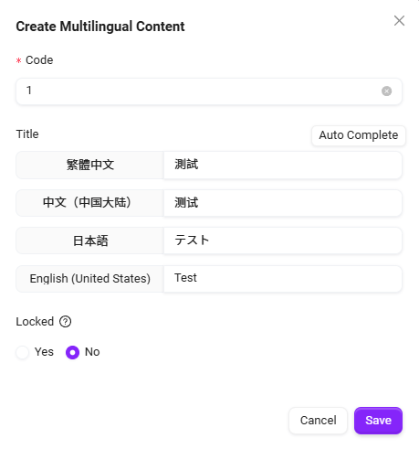 - 输入各语种的标题:为每种支持的语言输入标题。当前支持的语言包括: