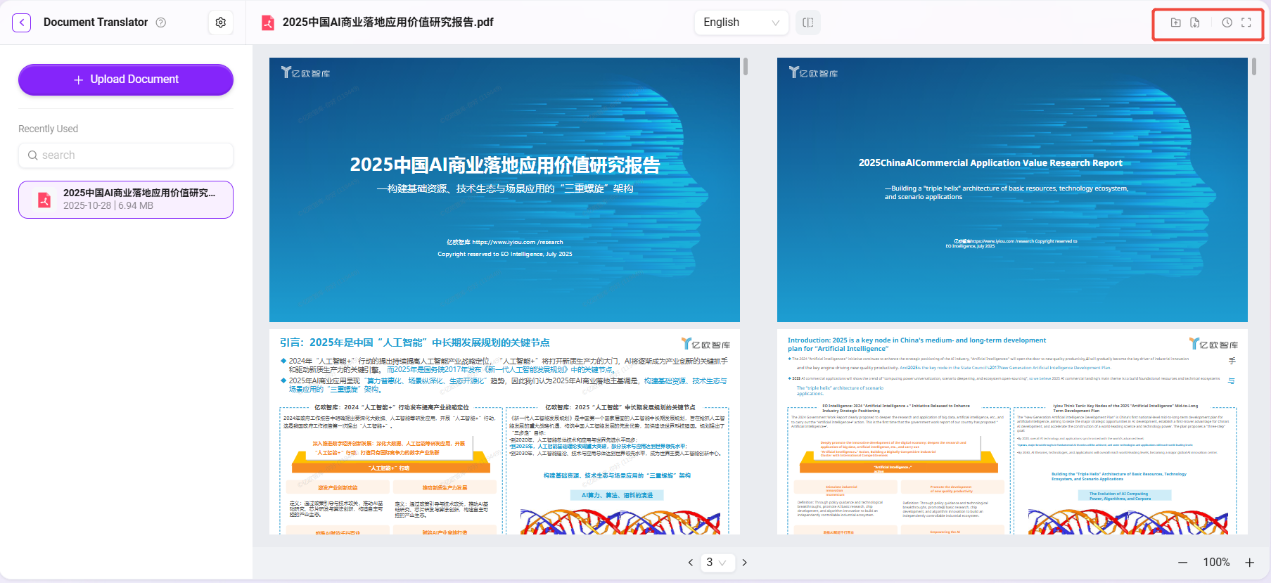 - 翻译完成后,页面将展示 原文与译文的对照视图,方便用户直观检查翻译结果;