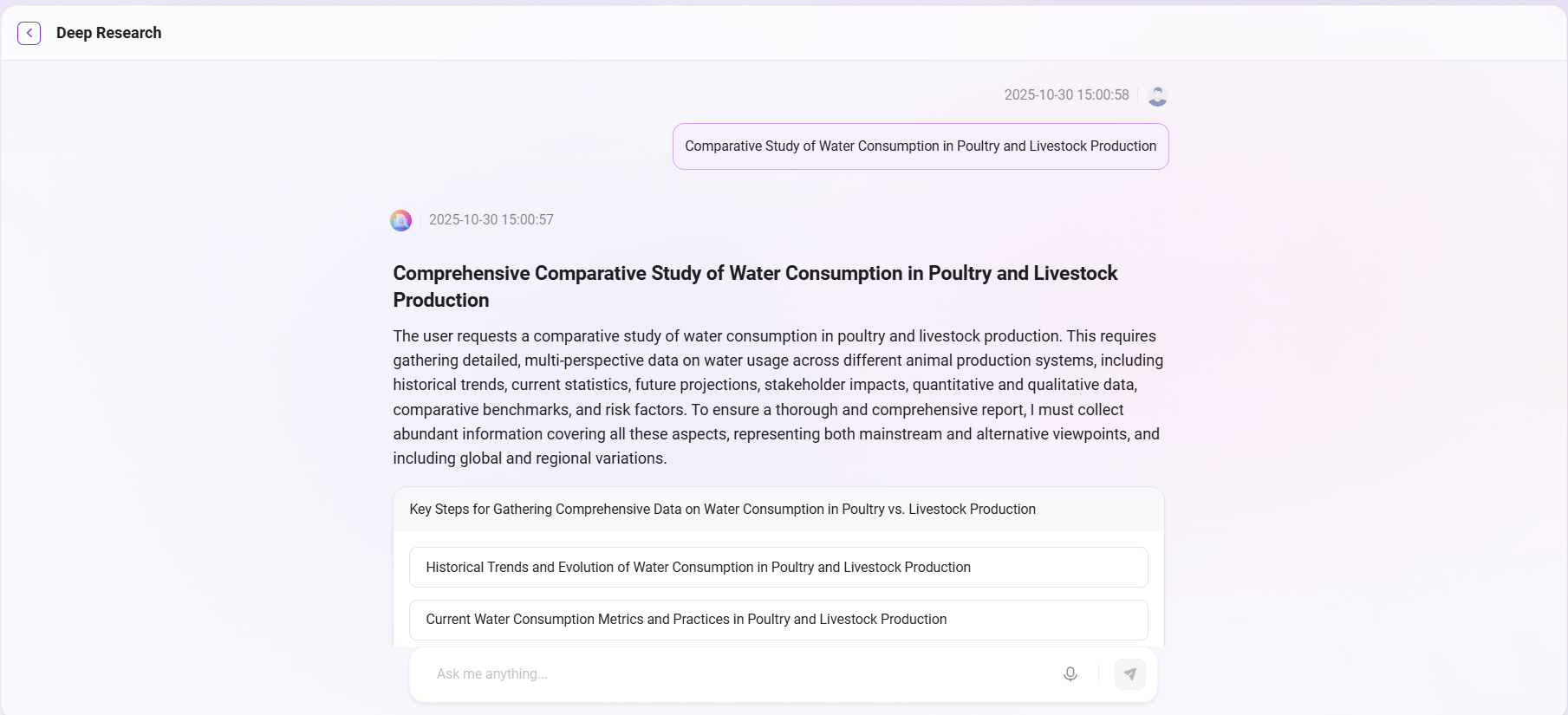 “Comparative Study of Water Consumption in Poultry and Livestock Production”; - 系统会自动进行分析,包括: