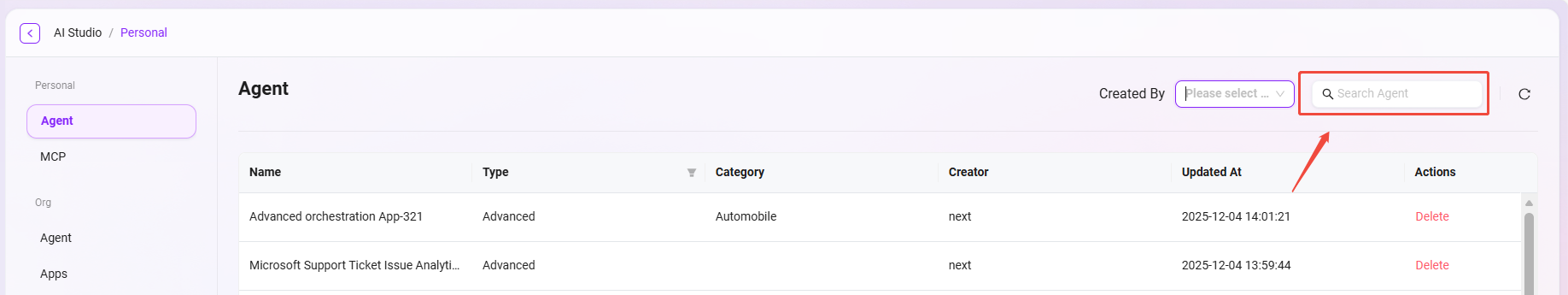 - 进入搜索功能:在智能体管理页面的搜索框中输入关键词。