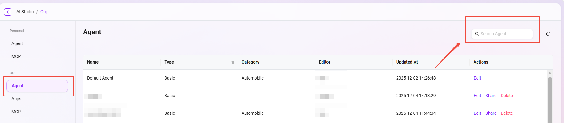 - 进入搜索功能:在组织智能体管理页面的搜索框中输入关键词。