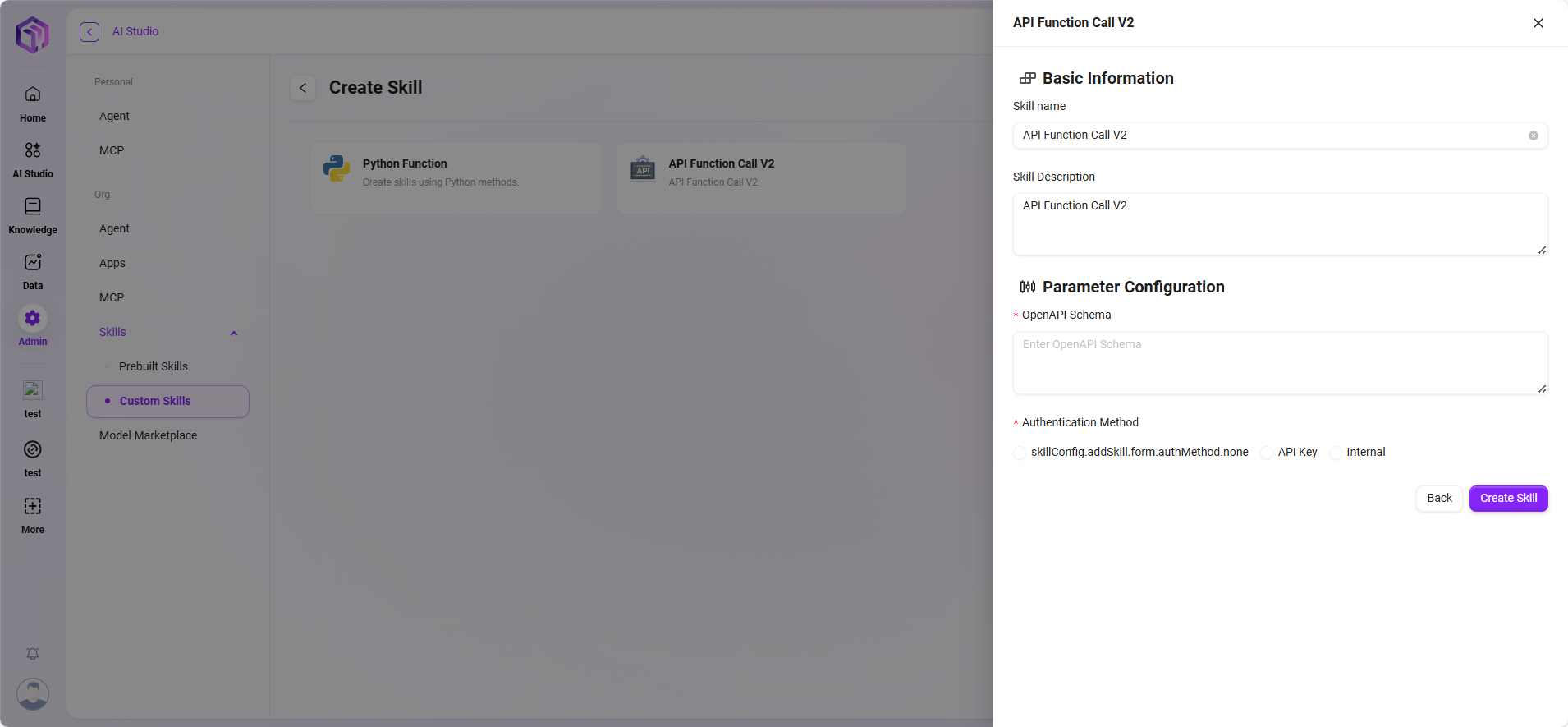 管理员可以在系统中管理组织级技能模块,这些技能是智能体可以调用的功能组件。通过组织技能管理,管理员可以沉淀和复用企业的核心业务能力。