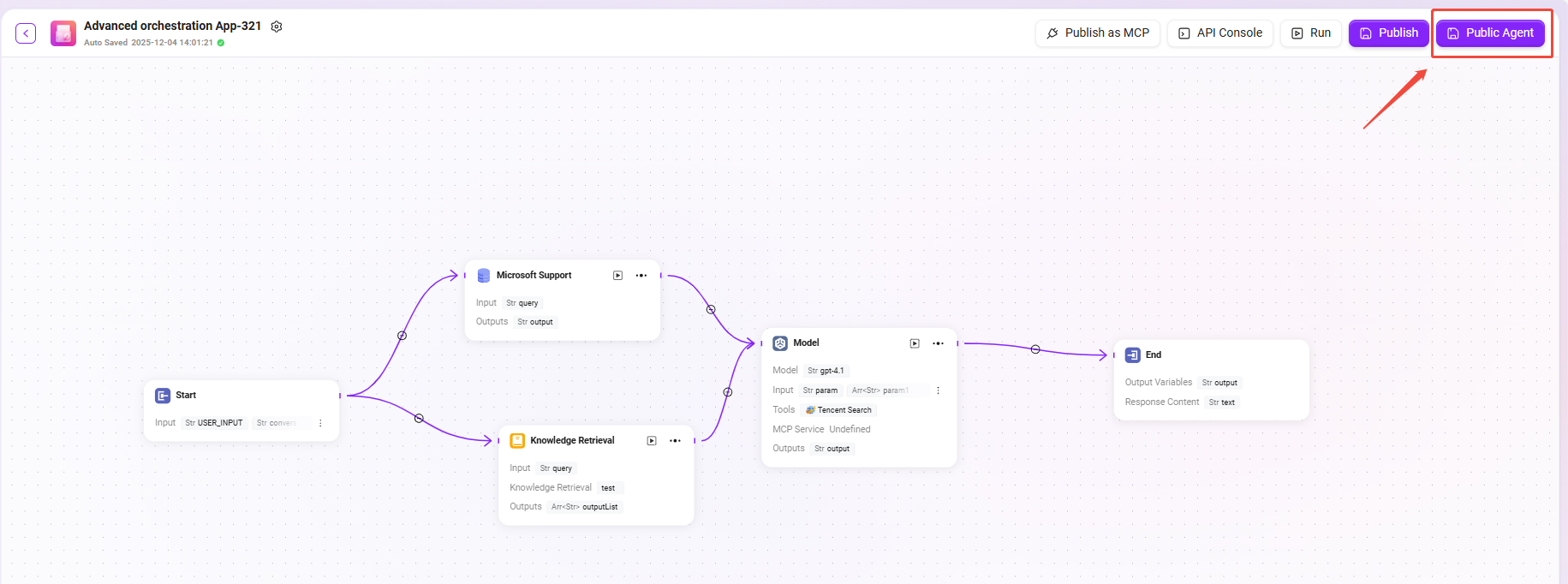 - 点击右上角的 “发布为 Agent” 按钮;