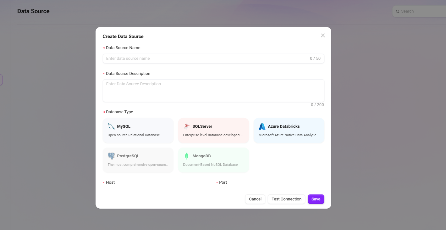 数据源是 AI Data 的入口与基础,用于将企业外部数据库或数据平台与 SERVICEME 平台连接,实现统一数据管理与分析。
