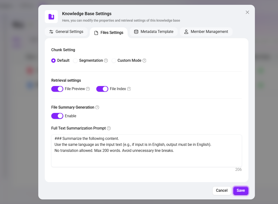 文件摘要生成:自动为知识库中的文档生成内容摘要,便于快速浏览核心信息。关闭后,新上传的文档将不再自动生成摘要。