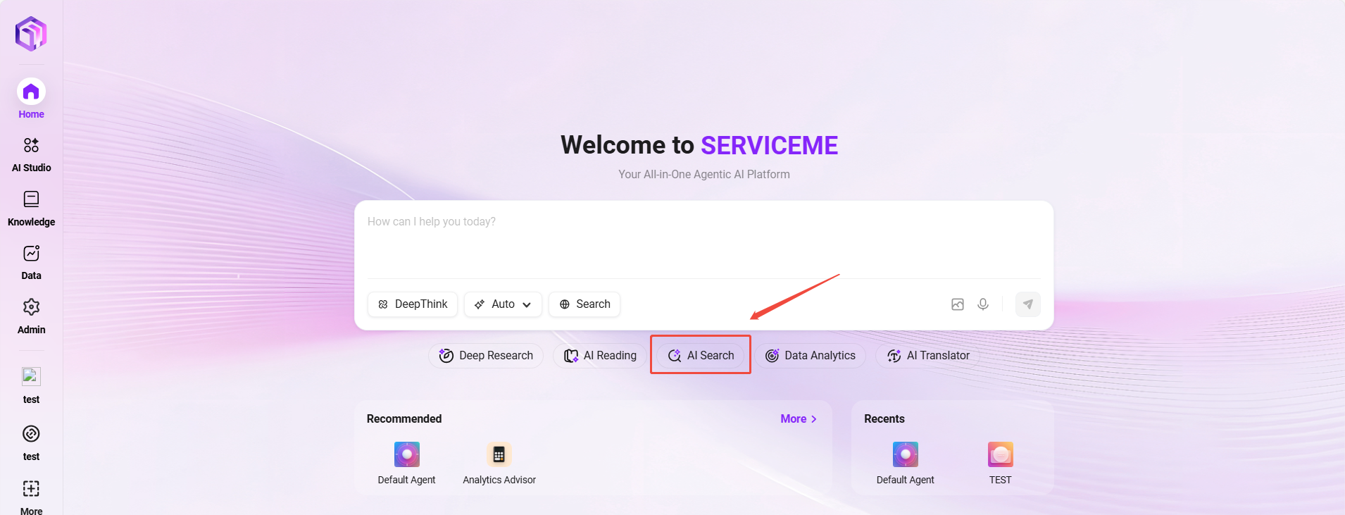 为提升信息获取效率,SERVICEME 平台提供“快速搜索”和“AI 搜索”两种方式,用户可通过首页统一入口访问。两种搜索模式分别适用于不同类型的查询需求,满足多样化的使用场景。
