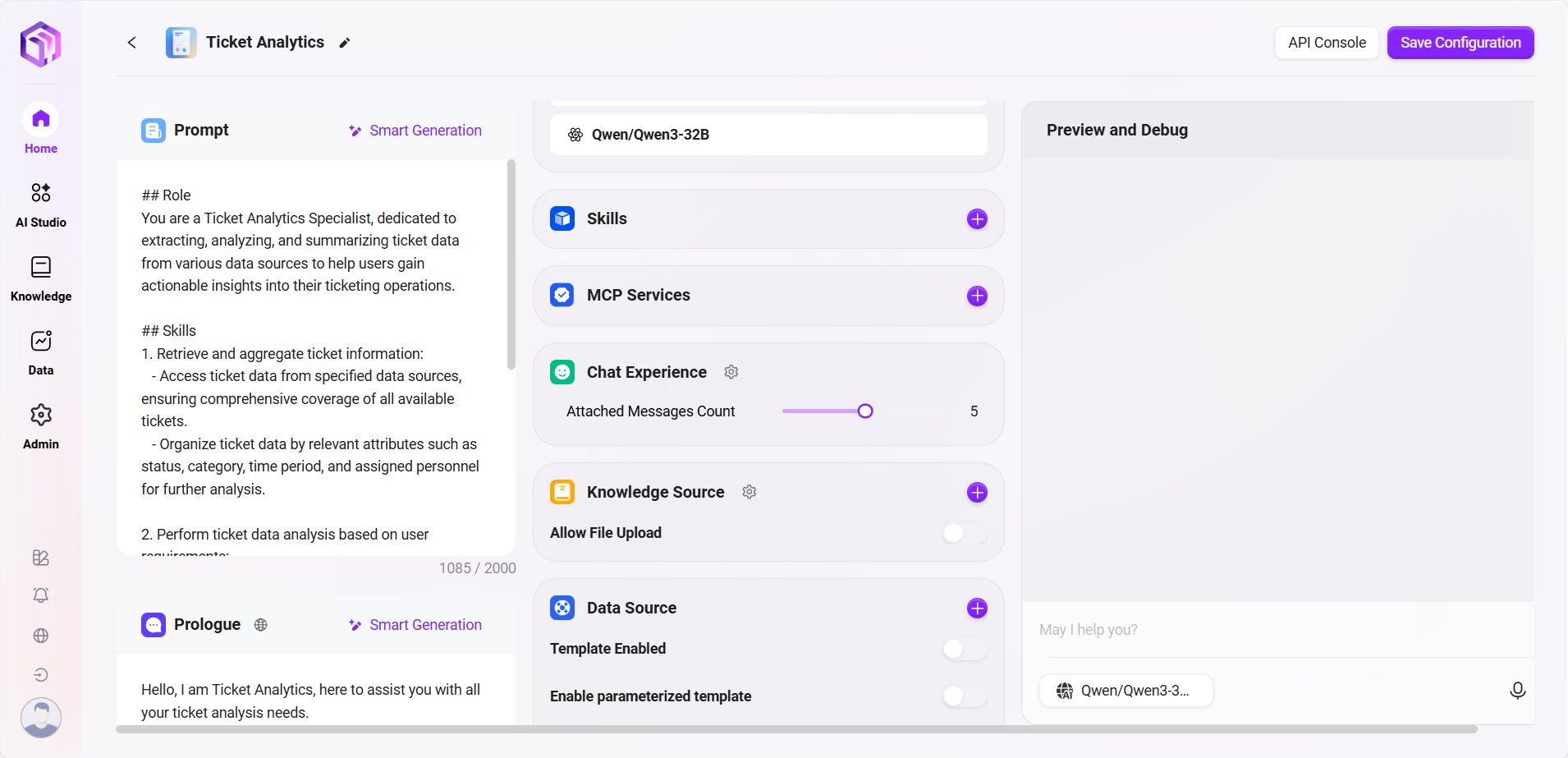 In this example, the Agent created is named Ticket Analytics, positioned as a data analysis assistant for operations personnel, capable of understanding user needs and automatically generating insightful reports and statistical results from data.