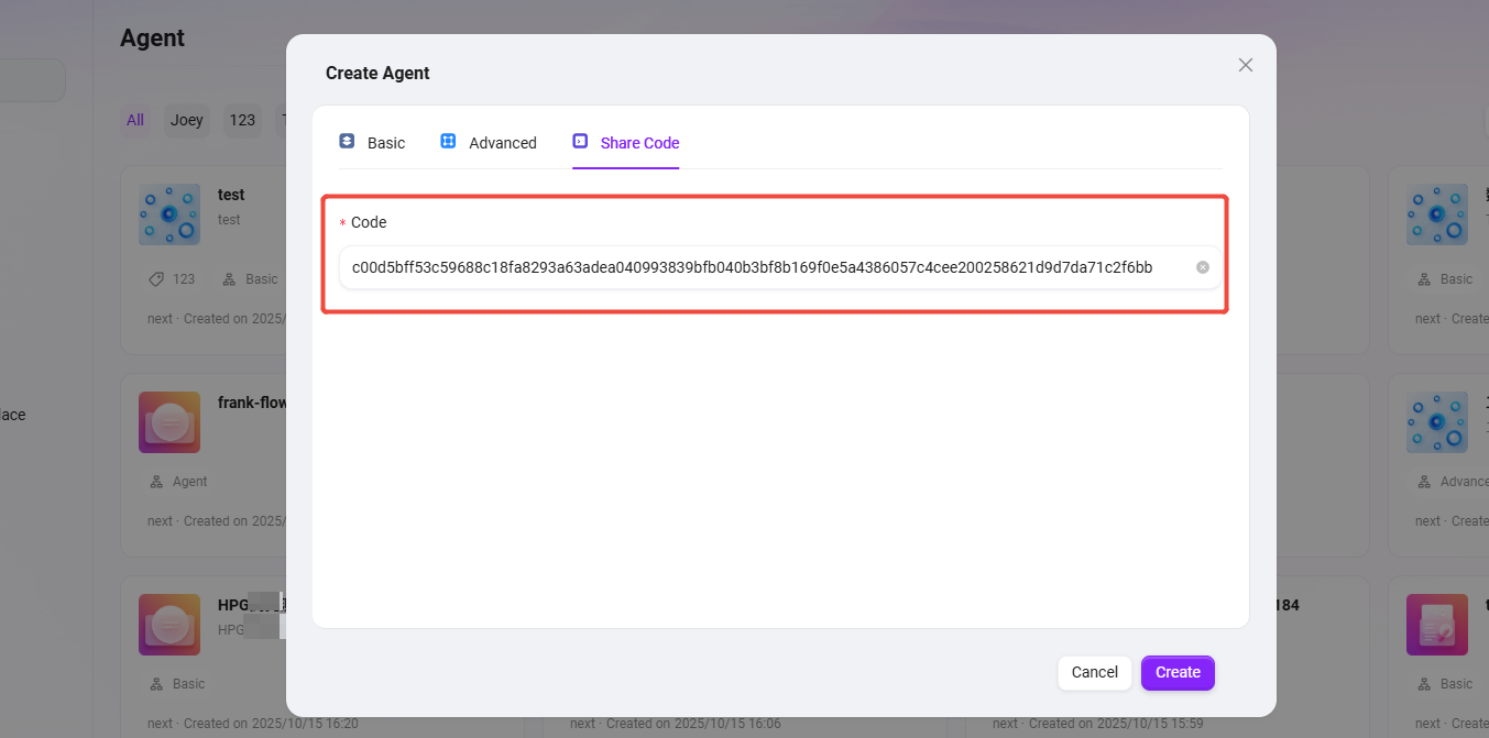 💡 Note: Agents created via the "Basic Creation" method currently do not support the sharing feature. To create shareable Agents, please use the "Workflow Creation" method.
