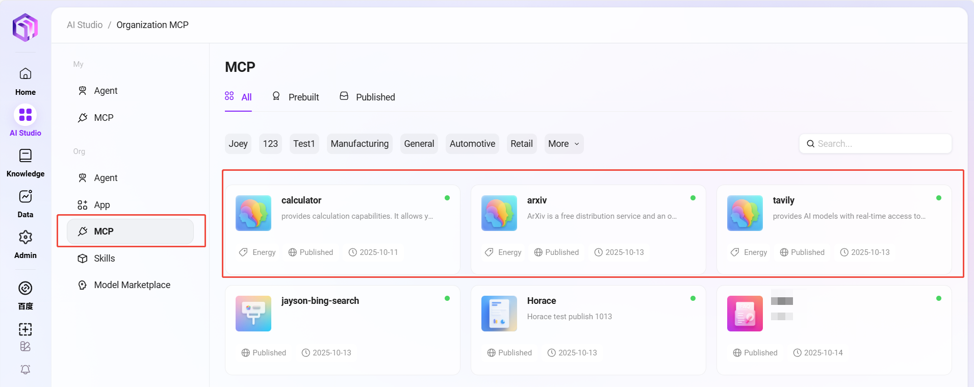 - On this page, in the MCP Services area, users select and enable the corresponding functional plugins according to their needs. For example, select the
