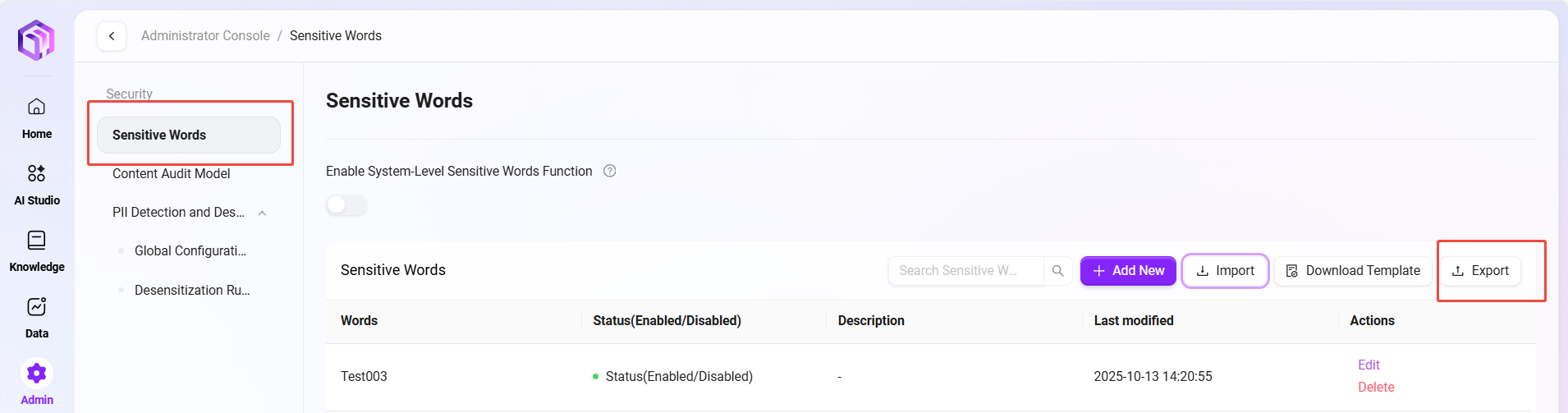 - Supports batch import and export, facilitating centralized management of large volumes of sensitive words