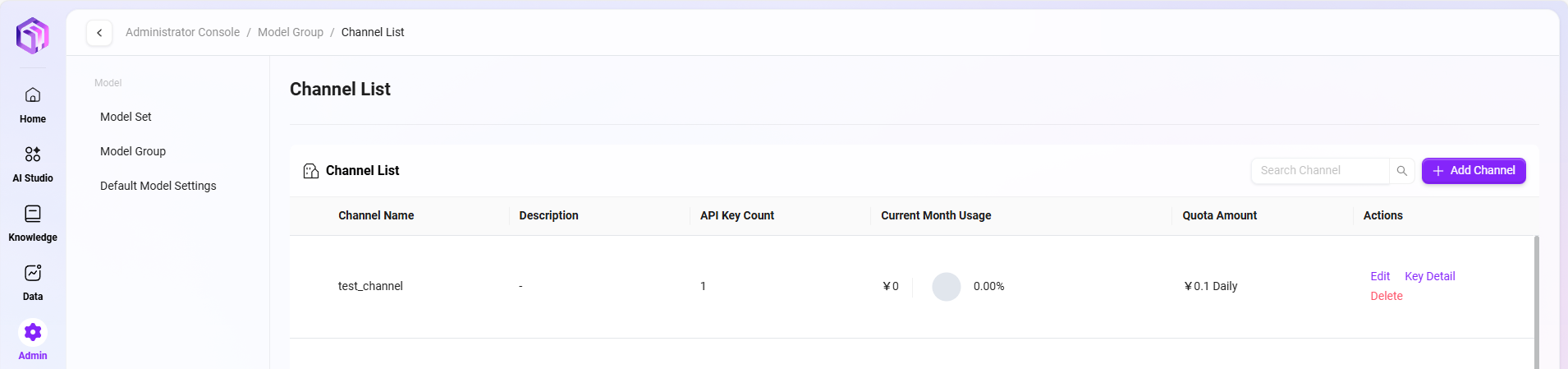After creating a model group, you can enter the "Channel Details" page to view all configured channels. You can: