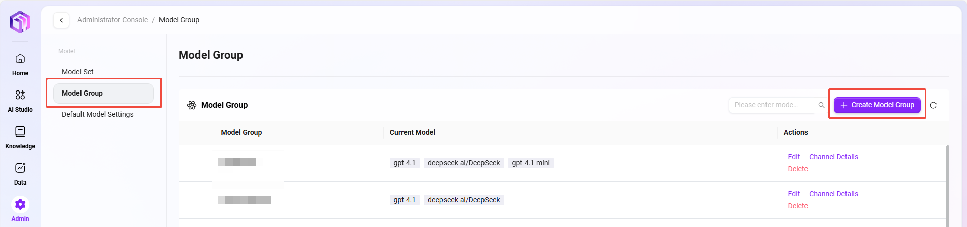 - Navigate to Model Group Management Page: Go to Management, select "Model Management", then click "Model Group".