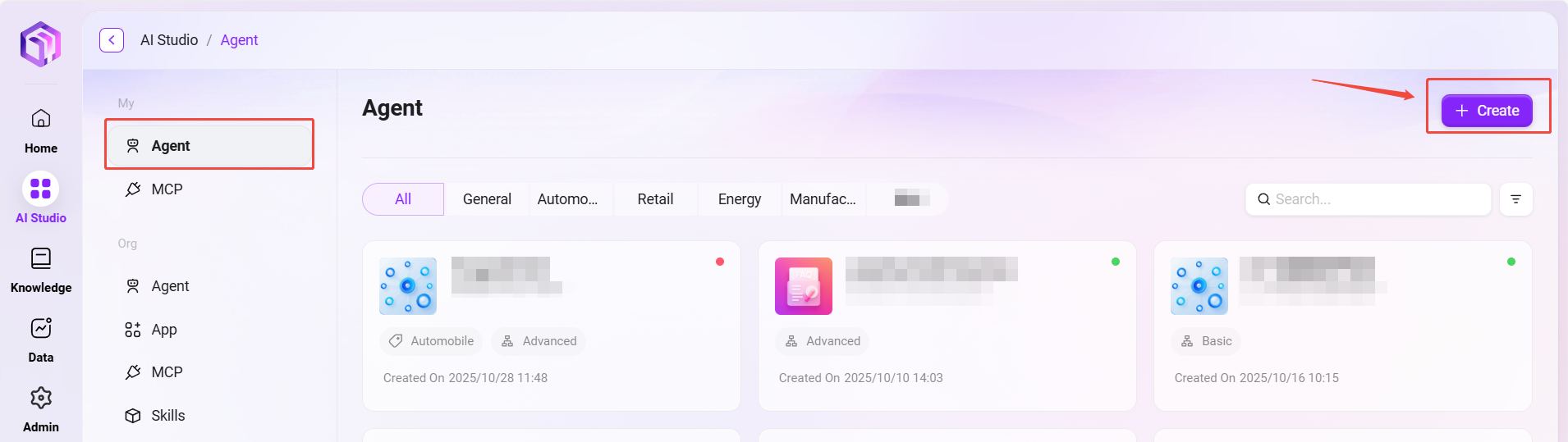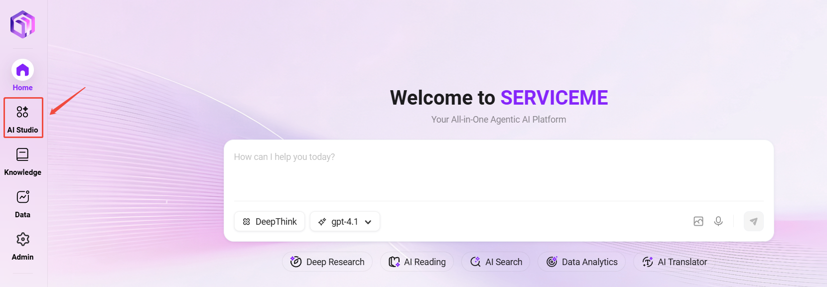 - Go to the SERVICEME NEXT homepage, click AI Studio in the left navigation bar to enter the Agent interface.