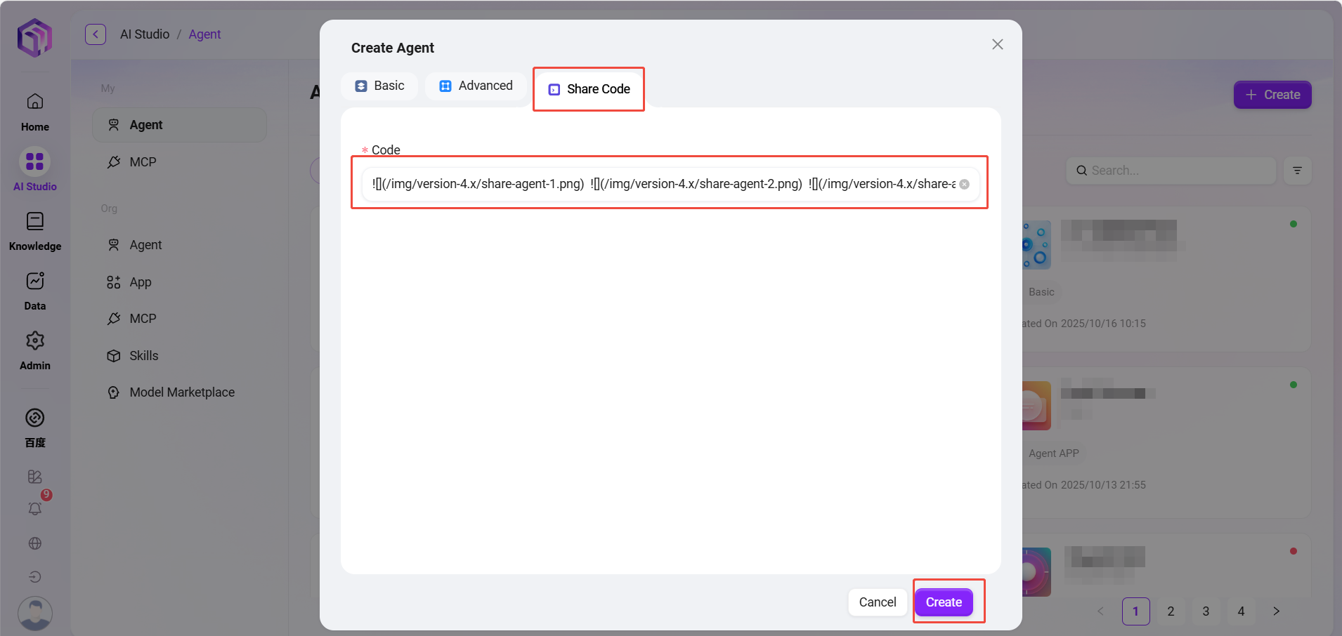 Validity of Configuration Codes: Configuration codes may become invalid due to updates to the source Agent. If creation fails, please contact the sharer to obtain the latest configuration code.