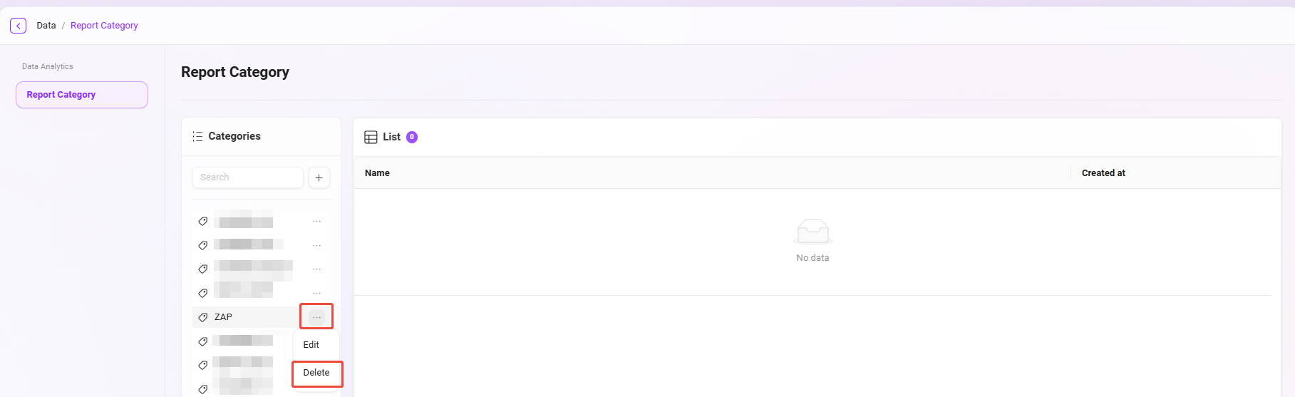 - Select the Report Category to Delete: In the report category list, select the category you want to delete.