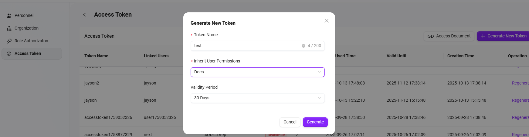 In the new system, Access Tokens are strongly associated with user permissions. Each token's access scope, validity period, and management permissions are uniformly controlled by the system to ensure the security and controllability of system resources.