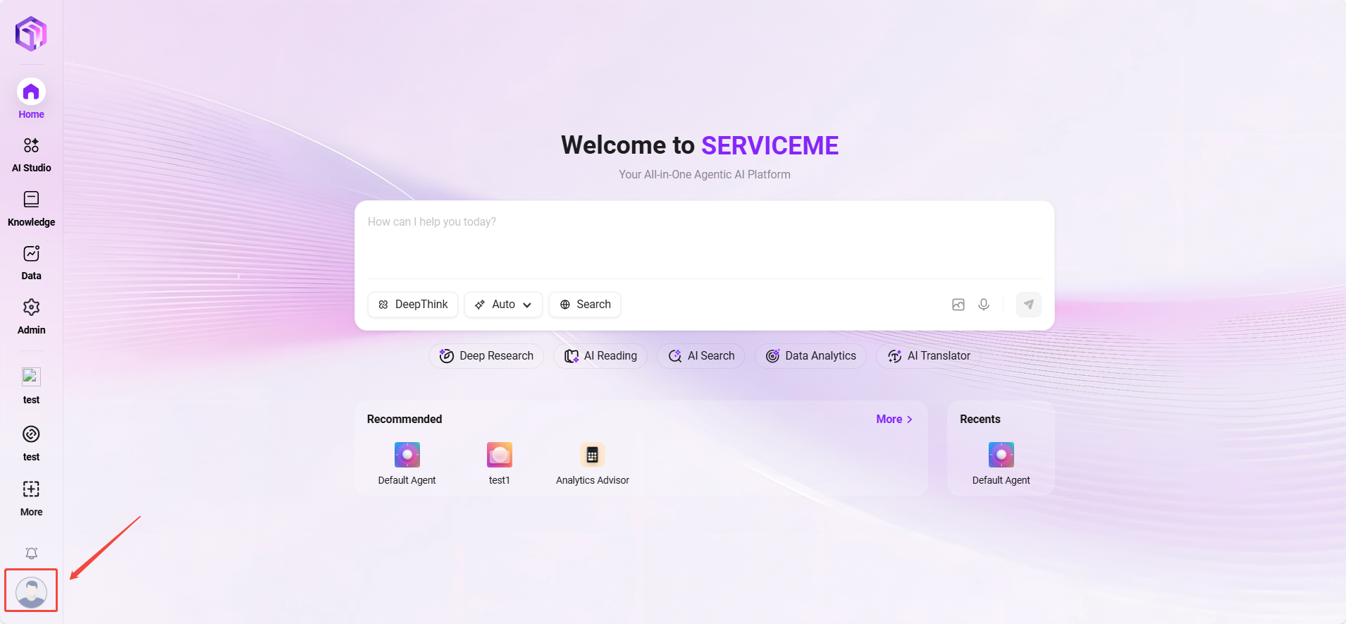 - Click the user avatar at the bottom right corner of the system interface to enter the Personal Center.
