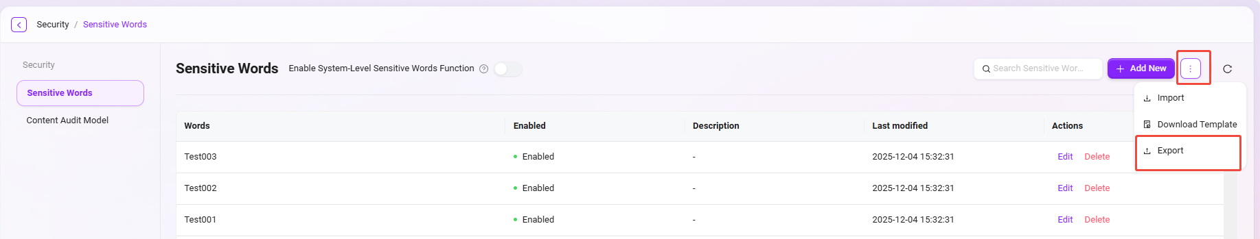 Content Security Management -> Sensitive Words -> Export. - After clicking export, the system will automatically download a