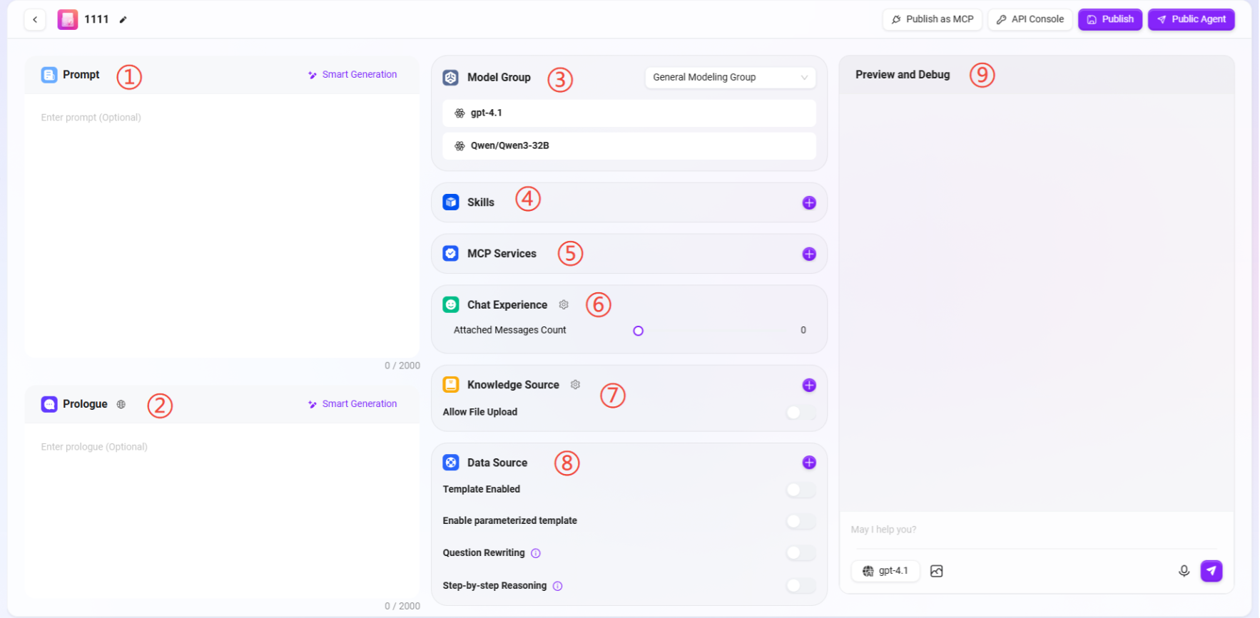 ① Prompt: Enter the assistant prompt. Intelligent generation of prompts based on existing ones is also supported (prompt character limit: 2000).