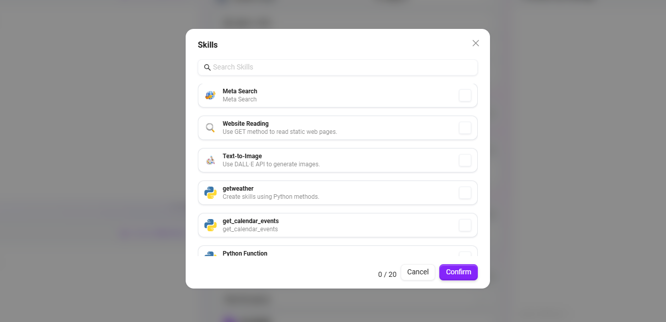 There are 7 default skills: Google Search, Tencent Search, G-Bing Search, Mitata Search, Text-to-Image, News Query Tool, Webpage Reading.