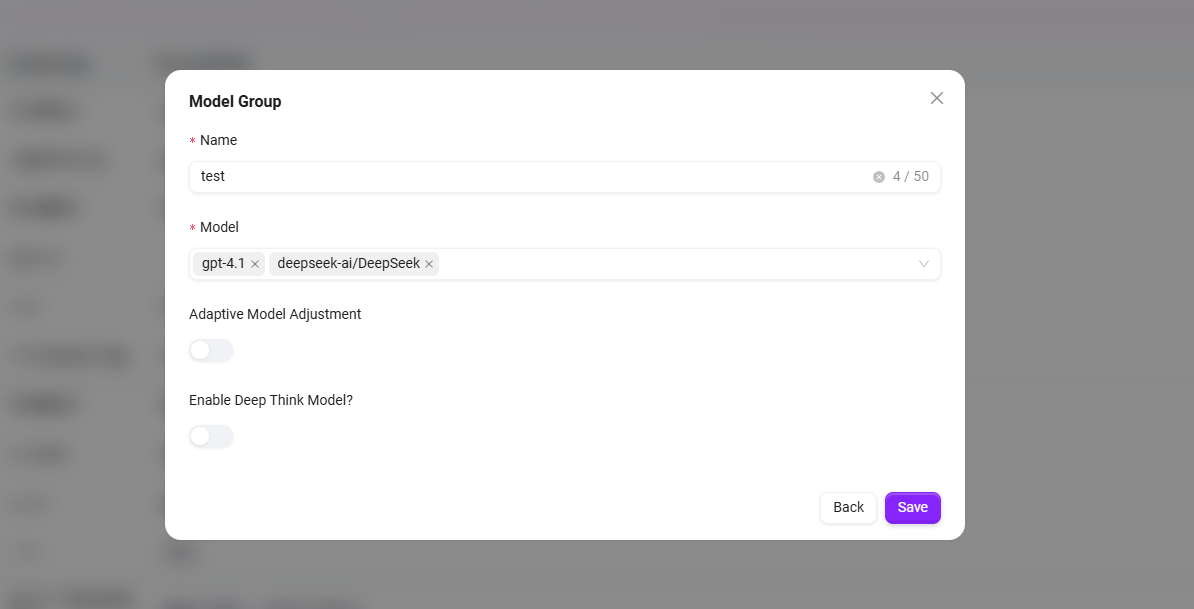 ③ Model Group: Click "+" to add a model group. Multiple models are supported.