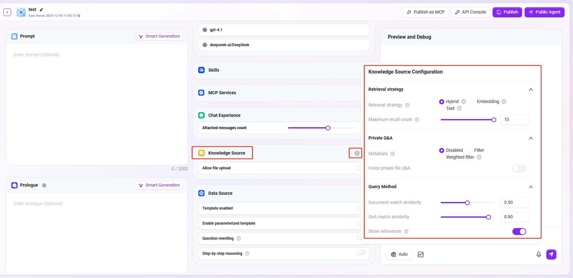 Knowledge Base Configuration: You can modify detailed settings such as "Retrieval Strategy, Private Domain Q&A, Retrieval Method".